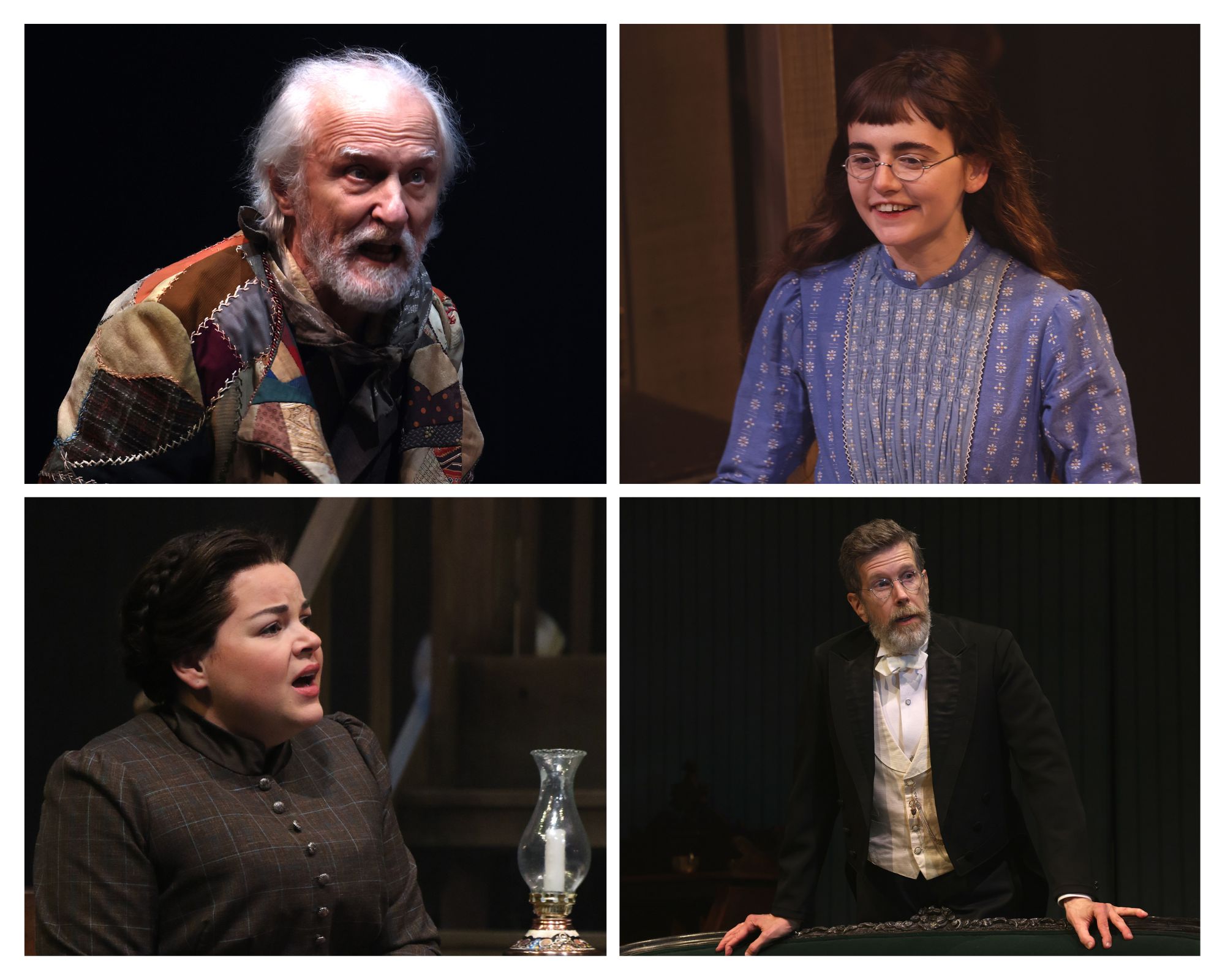 David Patrick Kelly (Old Ekdal), Maaike Laanstra-Corn (Hedwig), Melanie Field (Gina Ekdal)*, and Robert Stanton (Hakon Werle). (Photos by Gerry Goodstein* and Hollis King)