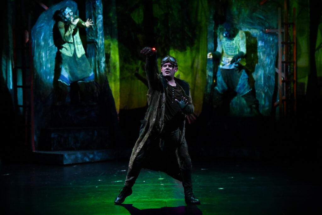 I was utterly blown away by the fearless athleticism expressed by this cast as well as the talents of its Choreographer and the troupe’s Co-founder Irina Tsikurishvili and Fight Choreographer Vato Tsikurishvili whose unforgettable portrayal of The Monster is sheer genius. Vato’s massive size and glowing bald head belie his jaw-dropping abilities in the fight scenes, but even more so in the heights he reaches with his leaps, tumbles and lifts in his tender scenes with Gaia. His unparalleled mime skills, and frankly, his entire performance, deserve a Helen Hayes Award.